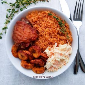 If balance had a flavor… it’d be jollof, plantains, chicken, and creamy slaw on one plate